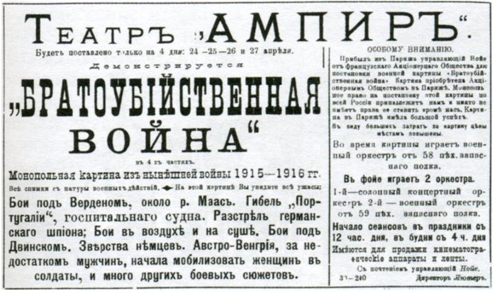 31 декабря (18.декабря по старому стилю) 1913 года в Воронеже состоялось открытие нового комфортабельного электротеатра «Ампир» (ныне кинотеатр «Спартак»). Он находился практически напротив другого популярного в городе электротеатра под названием «Тауматограф» (ныне в этом здании расположена филармония). В начале ХХ века кинобизнес набирал силу и после появления в Воронеже в 1899 году первой городской электростанции появилась возможность организовывать круглогодичные кинотеатры. В 1917 году в строй вступил и кинотеатр «Увечный воин» (ныне «Пролетарий»).
