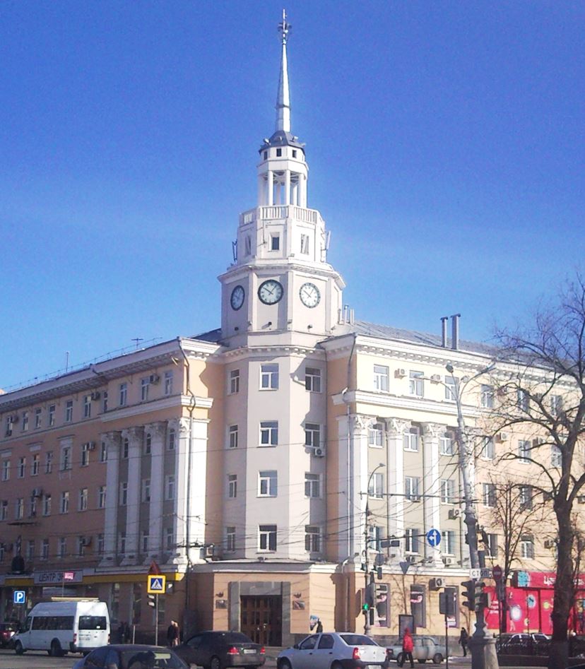 В январе 1939 года, было начато возведение в центре города новой гостиницы. История «Здания с башней и часами» на площади Ленина весьма интересна. В советское время центр города начал активно перестраиваться и Староконная площадь получила новое, более революционное и благозвучное название – теперь она стала именоваться площадью 20-летия Октября. Произошло это в 1937 году, а 7 ноября 1940 года на площади был торжественно открыт памятник Ильичу. В январе 1939 года исполком Воронежского горсовета принял решение о строительстве на площади 20-летия Октября (которая именовалась так до 20 апреля 1956 года; после этой даты она стала называться площадью Ленина) – новой гостиницы. Проектирование гостиницы было поручено архитектору А.В. Миронову. Строительство пятиэтажной гостиницы, а также возведение на площади памятника Ленину, началось в 1939 году и было закончено весьма быстро – уже в ноябре 1940 года. Поскольку возведение здания велось в самом сердце Воронежа, строительство осуществлялось в ускоренном режиме. Так на площади 20-летия Октября появилось новое здание гостиницы «Воронеж».